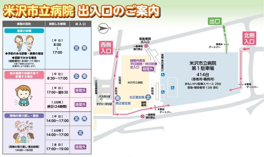 病院の出入口と駐車場